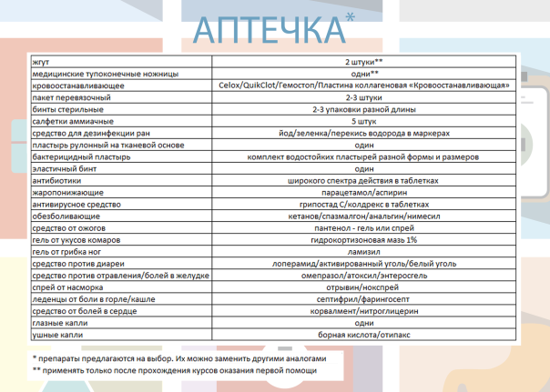 У велику аптечку варто зібрати препарати за списком у табличці. Щоб зменшити їх обсяг, витягнути таблетки з коробочок, інструкції скласти окремо, а на блістери наклеїти короткі записки – від чого препарат і як його приймати. Обсяг аптечки тут же скоротиться вдвічі.