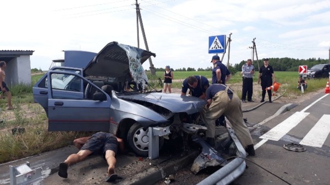 Внаслідок зіткнення автомобіля з відбійником, транспортний засіб відкинуло на узбіччя. Водій знаходився при свідомості, але був затиснутий конструкціями легковика.