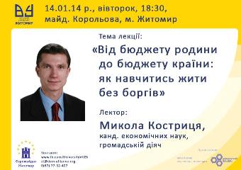 Уже за кілька годин, о 18:30 на сцені ВУЖа (майдан ім.С.Корольова) Микола Костриця для житомирян буде проводити лекцію "Від бюджету родини до бюджету країни: як навчитись жити без боргів".