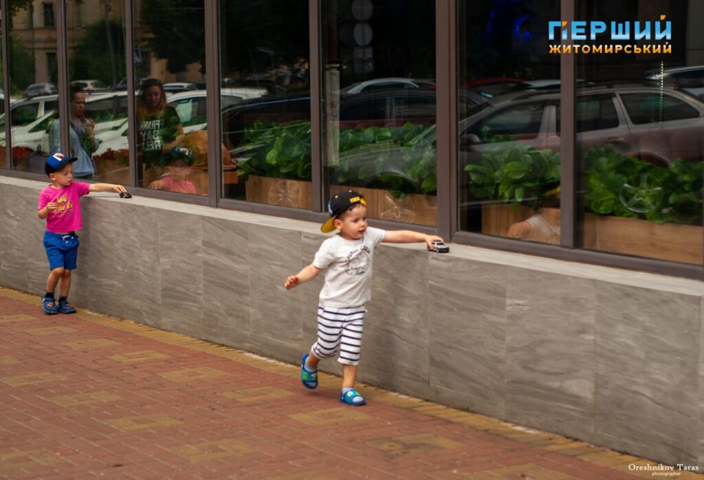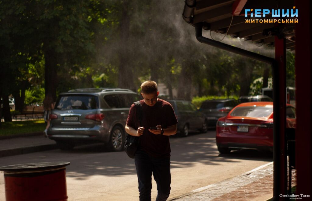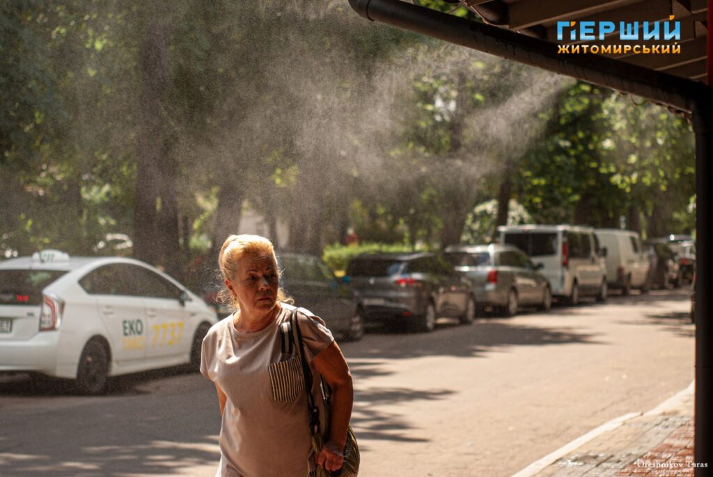 Житомиряни не оминають прохолодні розпилювачі, рятуючись від спеки.