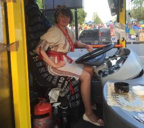 — Коли вдягаюся в українське вбрання, настрій покращується не лише у мене, а й у пасажирів, — каже 43-річна Валентина Шостак,. 10 років працює водієм столичного тролейбуса №14, до цього жінка жила в Олевському районі. На роботу Валентина ходить у народному вбранні.
