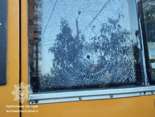 Близько 21 год. 18 чевня на Київській у Житомирі невідомі з автомобіля Ford стріляли із пістолета в бокове скло автобуса. Винуватці поїхали з місця події, проте їх розшукали ТОР.