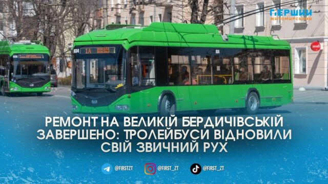 У Житомирі повністю відновили свій рух тролейбуси № 1Б, 2, 4А та 15А за їхніми звичними маршрутами. Транспорт знову курсує за регулярною схемою відсьогодні, 24 квітня.