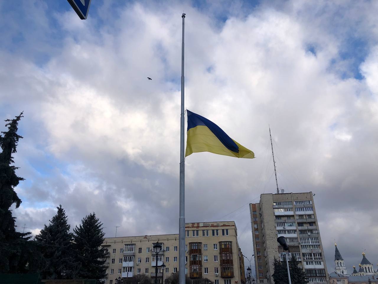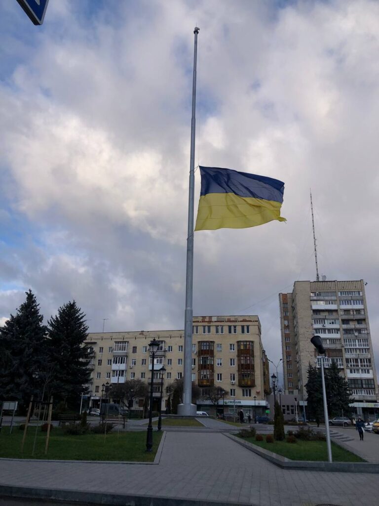 У Житомирі, 30 листопада, вітряна погода. Через це в центрі міста приспустили великий прапор України.