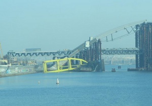Найбільший в Україні плавучий кран LK-600 Захарій був задіяний на монтажі арок на Подільському мосту з червня 2011 року.