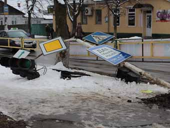 Як видно із фото, світлофор на зупинці Лесі Українки лежить на тротуарі.