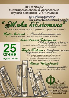 В рамках проекту "Жива бібліотека" житомирян запрошують 25 січня о 14.00 в обласну універсальну наукову бібліотеку ім. О.Ольжича.
