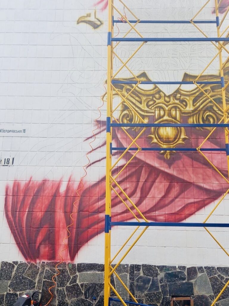 Художник Дмитро Краб малює на стіні ліцею №25 у Житомирі новий мурал. В образі жінки уособлюватиметься Україна.