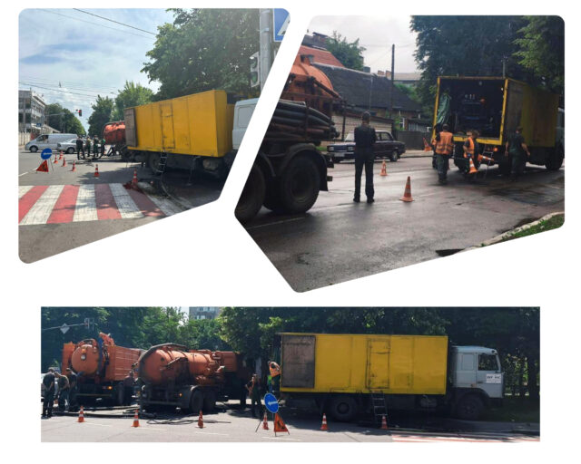 “Від ранку 15 працівників і 6 одиниць техніки прочищають засмічений каналізаційний колектор на перехресті вул. М. Грушевського – вул. І. Мазепи. Припускаємо, що каналізація забита відходами твердої фракції, такими,як будівельне сміття, тому навіть найпотужніші з існуючих машин для промивки мереж поки що не можуть впоратися із каналізаційним затором”, – повідомили на водоканалі.