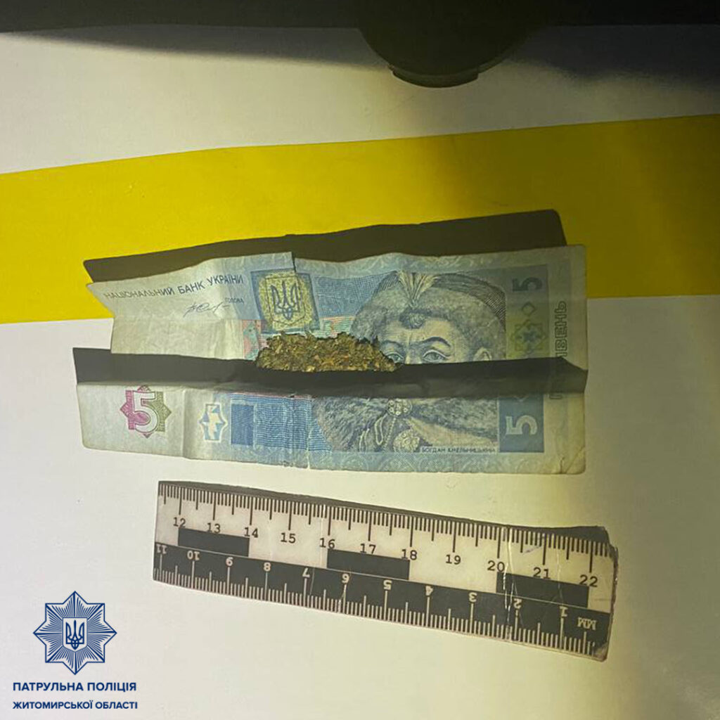 У Житомирі на вул. Вітрука під час комендантської години зупинили водійку Volkswagen. Дівчина мала неприродну блідість обличчя, розширені зіниці та тремтіння рук. Крім того, в неї виявили згорток із наркотиками.
