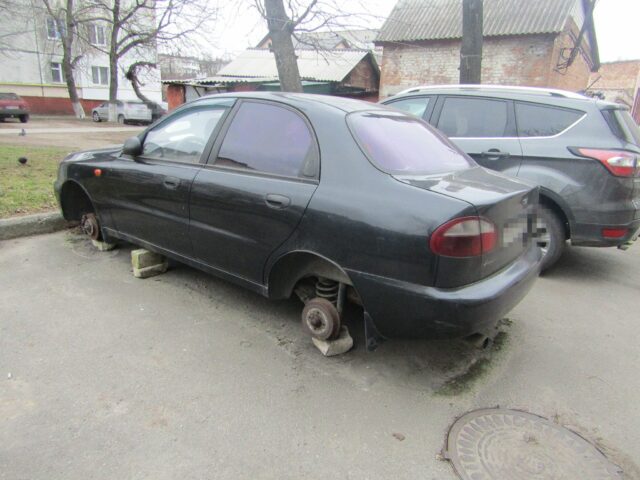 У дворі багатоповерхівки в Житомирі вночі зняли колеса із автомобіля, підставивши цеглу. Власниця автівки 31 річна-житомирянка, побачивши свій автомобіль без коліс, звернулася до поліції.