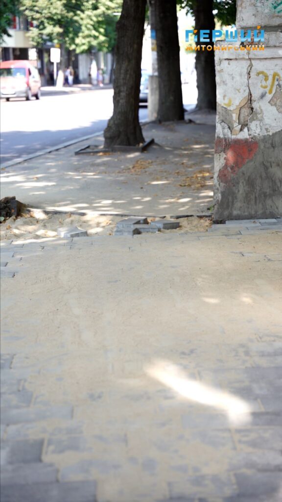 У Житомирі триває ремонт тротуарів на вул. Великій Бердичівській, ділянка від перехрестя І. Кочерги до вул. Шевченка, ліворуч. Тут старий асфальт замінюють на плитку, також встановлюють тактильну плитку.