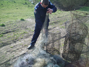 Під час обстеження одного зі ставків просто з води правоохоронці витягнули рибальські сітки загальною довжиною до тисячі метрів, що була дбайливо розставлена браконьєрами. Окрім того, з тієї ж таки водойми було вилучено ще й сім так званих «ятерів» – саморобних металевих пасток, призначених для вилову риби.