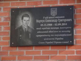На меморіальній дошці навіки викарбувані слова на граніті: «У цій школі навчався Марчук Олександр Григорович, який героїчно загинув, виконуючи військовий обов’язок по захисту суверенітету та територіальної цілісності України. Слава Україні! Героям слава!».