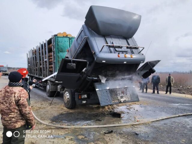 МАЗ із 30 кубометрами деревини загорівся 5 березня поблизу с. Прилуки Овруцького району. Вогонь міг за секунди перекинутися на деревину.