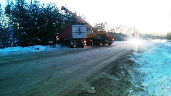 З’ясувалось, що при повороті з траси на пилораму вантажівку занесло і напівпричіп з’їхав у кювет. За допомогою тросу та пожежного автомобіля рятувальники вилучили транспортний засіб зі снігової пастки.