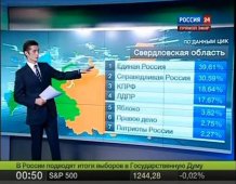 За виведеними на екран показниками, у "Єдиної Росії" – 58,99%, у КПРФ – 32,96%, у "Справедливої ??Росії" – 23,74%, ЛДПР – 19,41%, а у "Яблука" – 9,32%.