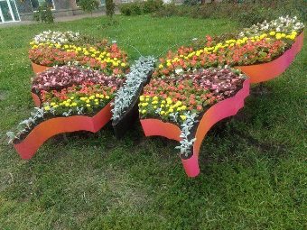Різні види квітів помістили у металеву конструкцію у формі метелика.