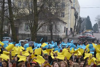 Студенти з різних інститутів та факультетів, а також професорсько-викладацький склад ЖДУ імені Івана Франка піднімуть папірці жовтого і блакитного кольорів так, щоб утворити карту України.