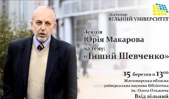 Лекцію на тему: «Інший Шевченко» для слухачів Вільного університету в Житомирі читатиме журналіст, телеведучий, документаліст Юрій Макаров. Він розгляне переосмислений образ найвідомішого українського поета – не «героя у вишиванці, чоботах, смушковій шапці, з вусами й смутком в очах», а того Шевченка, який «почав прориватися в широкий культурний на початку двохтисячних — молодого, гарного, модного чоловіка, улюбленця жінок і завсідника світських салонів». Юрій Макаров говоритиме про новаторство та модерність Шевченка та його текстів.