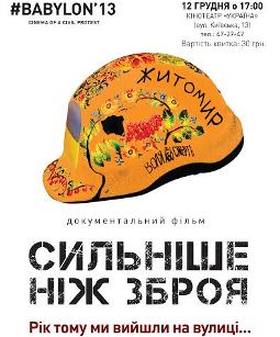 «Сильніше, ніж зброя» перший повнометражний документальний фільм BABYLON’13. Прем’єрний показ у Житомирі 12 грудня о 17:00 (кінотеатр «Україна», вул. Київська, 13). Вартість квитка: 30 грн.