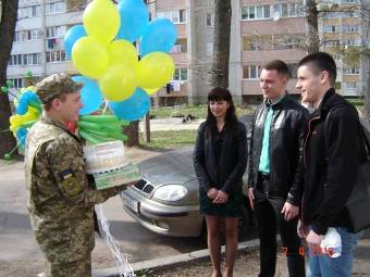 Зокрема, біля військової частини пообіді троє студентів Житомирського державного технологічного університету – Віталія Нетребін, Євген Кравчук та Юрій Лінивий разом із волонтером Олегом Бойко, вітали десантника 95 бригади Дениса, який через ситуацію на Сході країни, два роки поспіль святкував свій День народження далеко від дому та ще й в бойових умовах.