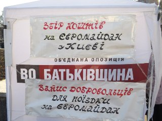 Бажаючі поїхати на євромайдан у Київ можуть залишити свої координати у спеціальному блокноті в наметі "Батьківщини" навпроти ОДА на майдані Корольова. Жіночки, що роздають агітаційні матеріали кажуть, що можна записатися і лишити свій номер, а потім з людьми з’вяжуться.