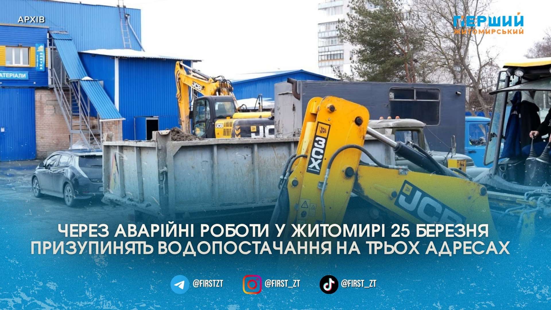 У Житомирі 25 березня тимчасово призупинять водопостачання за кількома адресами через аварійно-відновлювальні роботи.