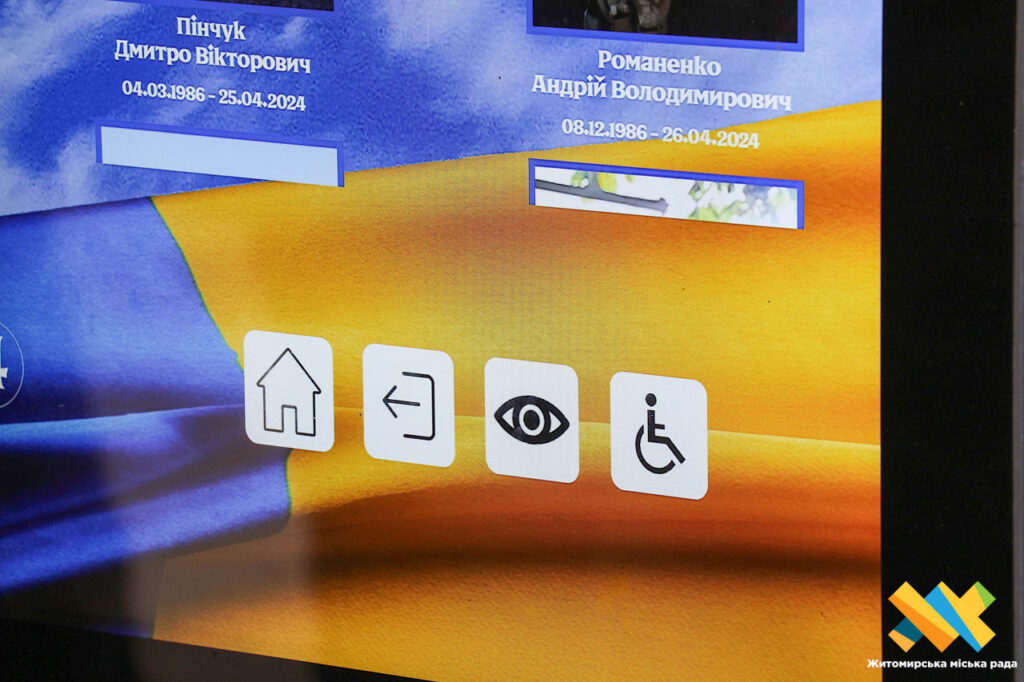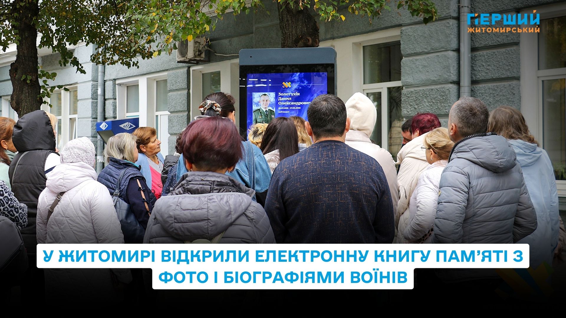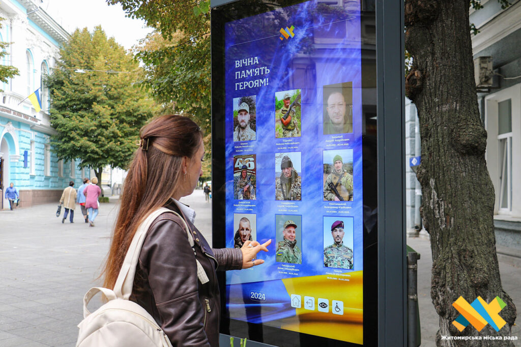 Електронна Книга пам’яті у Житомирі запрацювала на вулиці Михайлівській. Тут зібрані імена, світлини та біографії військових, які загинули або померли, захищаючи Україну з 2014 року. Про це повідомили у Житомирській міській раді.