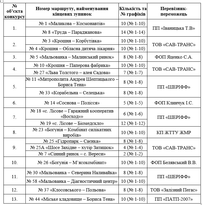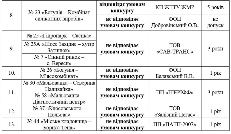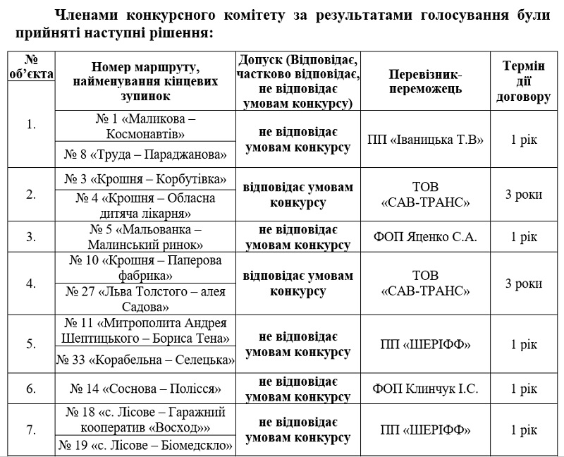Згідно із документу, на 21 маршруті працюватимуть 13 перевізників. Більшість із них (транспорт 11 перевізників) не відповідають умовам конкурсу, тому договори з ними укладуть на 1-3 роки. Відповідає умовам лише ТТУ на маршруті №23, де договір укладуть на 5 років, та ТОВ “САВ-ТРАНС”, із яким укладуть угоду на 3 роки.
