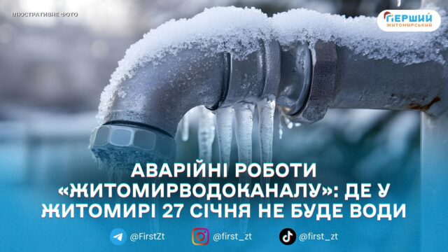КП «Житомирводоканал» повідомило, що через аварійно-відновлювальні роботи 27 січня у Житомирі тимчасово призупинять водопостачання на низці вулиць і провулків. Воду обіцяють подати одразу після завершення робіт.