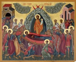 «Згідно з церковним переданням, в день, коли Богоматір мала відійти у вічність, апостоли залишили місця своєї проповіді та дивним чином зібрались в Єрусалимі, щоб попрощатись з Пресвятою Богородицею та здійснити погребіння її пречистого тіла. Перебуваючи навколо її ложа, вони були засліплені яскравим світлом, в якому явився Христос в оточенні ангелів та архангелів. У цей момент чиста душа Діви Марії без страждання, ніби уві сні, відійшла до Господа. Іконографічна традиція свята розповідає, що Богородиця віддала свою чисту душу в руки свого Сина і Господа Ісуса Христа, а в цей час з небес лунали звуки ангельських хорів», – розповідає отець Віктор.