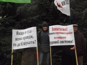 В руках тримають плакати із написами «Якщо в суді нема правди, то де її шукати», «Суддів-хабарників за грати», «В Україні буде справедливий суд», «Вимагаємо повного перезавантаження та очищення судової системи», «Народ – це влада. Разом змінимо суди».