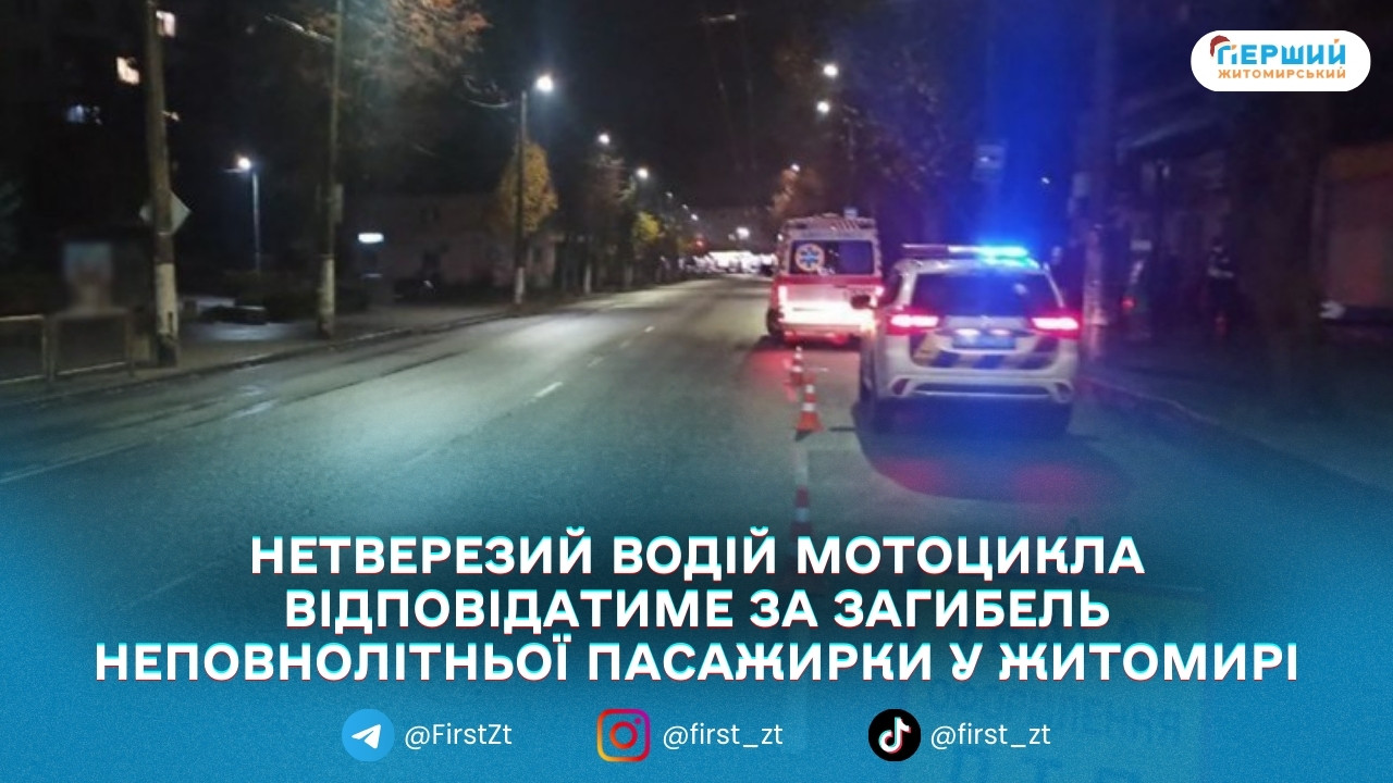 Трагедія сталася ввечері 9 листопада на вулиці Перемоги в обласному центрі. Близько 21:55 водій мотоцикла «Дніпро», 36-річний житомирянин, рухаючись у напрямку майдану Короленка, перевищив дозволену швидкість, проявив неуважність до дорожньої обстановки та допустив некерований рух транспортного засобу, після чого мотоцикл упав.