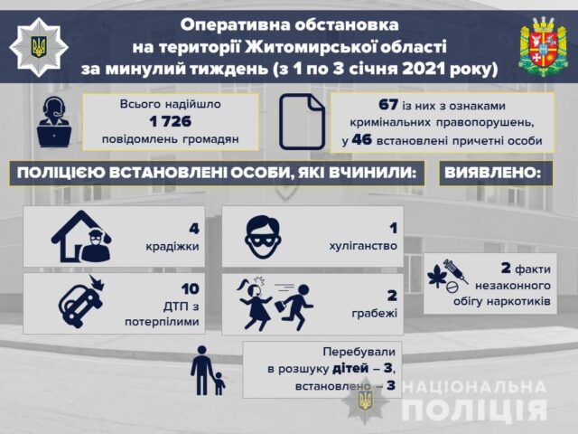 1726 повідомлень надійшло до поліції від жителів Житомирської області упродовж 1-3 січня 2021 року.