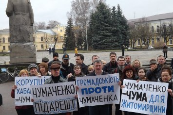 Активісти з собою на акцію під ОДА привезли плакати "Чумаченка підарешт", "Громадськість проти Чумаченка", "Чумаченко – чума для Житомирщини".