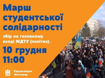 10 грудня 2013 року оголошено Днем студентської солідарності. Цього дня житомирські студенти об 11:00 зберуться біля ЖДТУ (політеху) і пройдуть колоною: