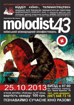 Відділ «кіно-, телемистецтва» Житомирського коледжу культури і мистецтв ім. Івана Огієнка запрошує небайдужих до кіно житомирян підтримати кінофестиваль і 25 жовтня переглянути програму національного показу, а також майстер-клас від Давіда Полонського (режисер-постановник фільму «Вальс з Баширом» та фільму-закриття Молодості-43 за мотивами Станіслава Лема «Конгрес»), – пише у своєму блозі Ігор Шурпан.