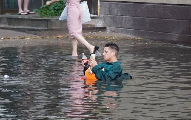 Житомиряни і цього разу креативно вийшли із ситуації: на вул. Покровській купався хлопець. Він, ніби на пляжі, лежав у воді, сьорбав колу і заїдав шаурмою. Минулого разу по каналах Житомира каталися на гідроциклах і плавали на матрацах.