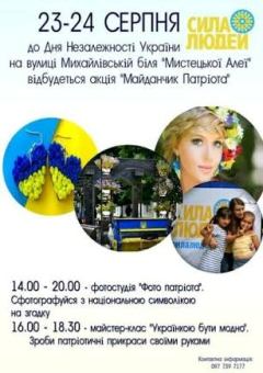 З 14.00 по 20.00 буде працювати фотостудія "Фото патріота". Кожен бажаючий має можливість сфотографуватися з національною символікою на згадку про 23-річчя Незалежності України і поставити фото собі на аватар у соціальні мережі. Покажи світові, що ти українець!