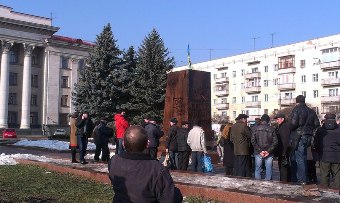 Декілька десятків Житомирян зібралися на майдані Соборному біля поваленого пам’ятника Леніну обговорюють нічні події.