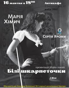 16 жовтня о 18.00 в приміщенні "Антикафе" (вул. В.Бердичівська, 41) відбудеться репрезентація збірки поезій "Білі шкарпеточки" Марії Хімич за участі саксофоніста Сергія Яроми.