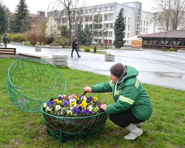 У Житомирі працівники КП “Зеленбуд” 22 квітня висаджують квіти у центрі міста. До Великодня квіткові чаші у вигляді гігантських яєць наповнюють синьо-жортими віолами.