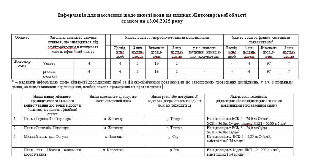 Станом на 13 червня 2025 року жоден з офіційних пляжів Житомирської області не пройшов перевірку за показниками якості води. Це означає, що купатися на популярних водоймах зараз небезпечно.