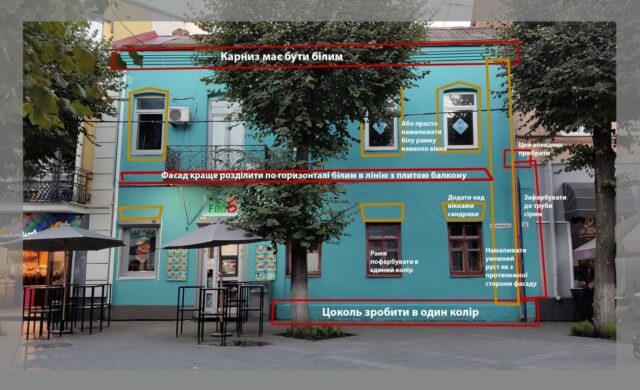 «Перше, що сильно вразило – занадто насичений колір, який контрастує з сусідніми фасадами та нічим не розбавлений. Деякі елементи не дорого виготовити з гіпсу, наприклад – сандрики, всього лише 4 штуки. Деякі елементи можна просто домалювати, як от руст чи рамки навколо вікон, пілястри, фронтончики…».