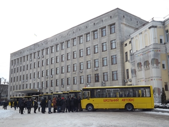 На майдані Корольова під стінами Житомирської ОДА 16 грудня презентували 12 шкільних автобусів, які вже з понеділка підвозитимуть учнів із різних районів області до навчальних закладів.