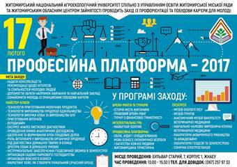 Регіональний проект «ПРОФЕСІЙНА ПЛАТФОРМА-2017/PROFESSIONAL PLATFORM-2017» проходитиме 17 лютого 2017 р. о 13.00 на базі ЖНАЕУ, м. Житомир, бульвар Старий, 7 (актова зала).