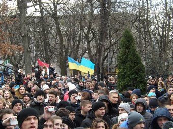 По дорозі студенти кричали "Україна понад усе", "Банду геть", "Слава Україні", "Смерть ворогам", "Україна – це Європа", співали гімн та українські пісні.