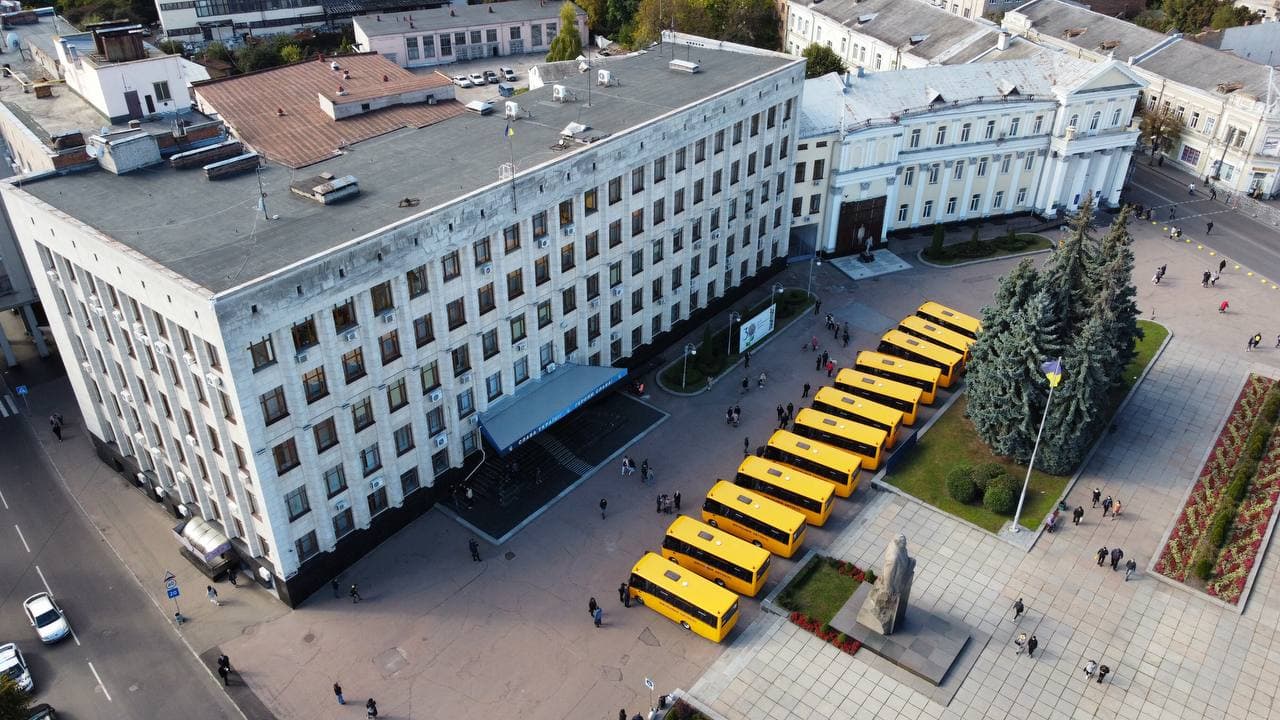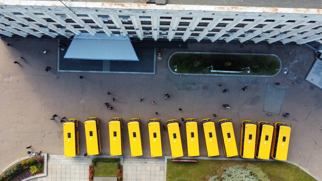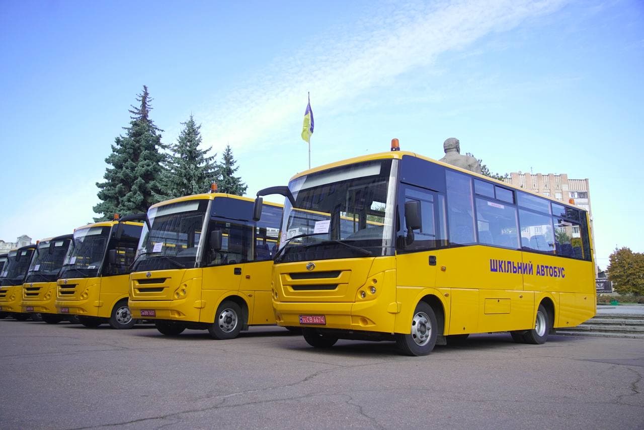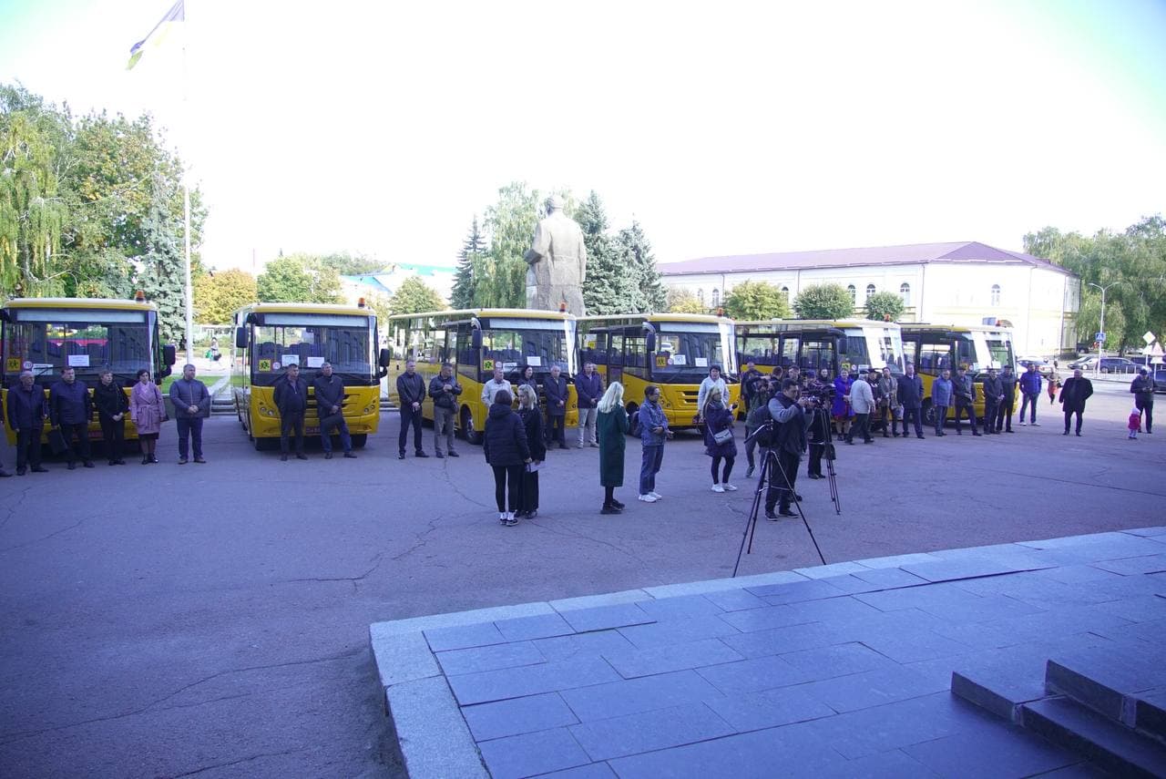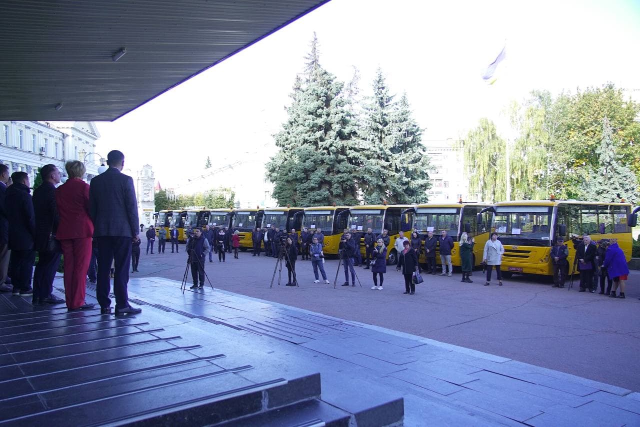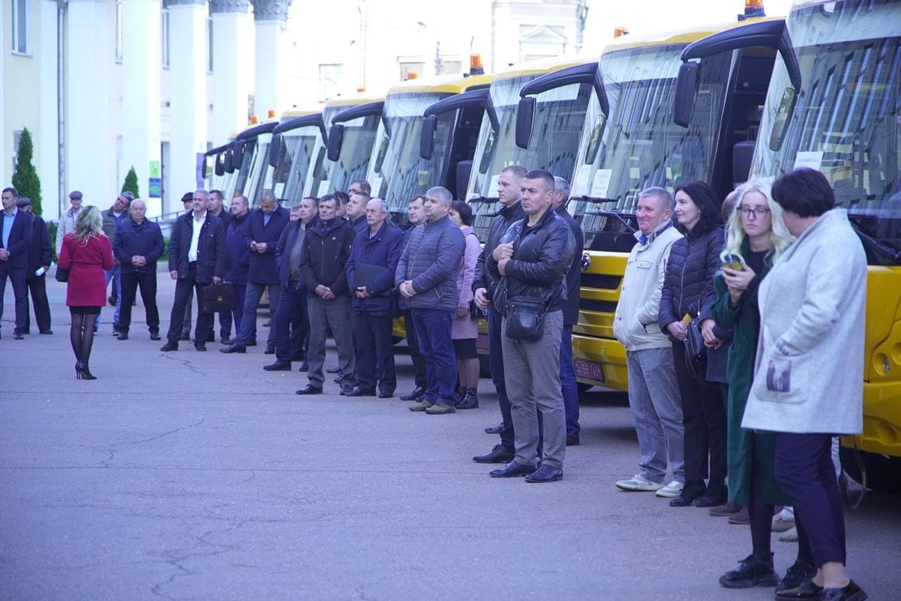 Територіальні громади Житомирщини отримали 12 шкільних автобусів для підвозу учнів. Урочисте передання транспорту школам відбулося у понеділок, 4 жовтня, біля обласної адміністрації.