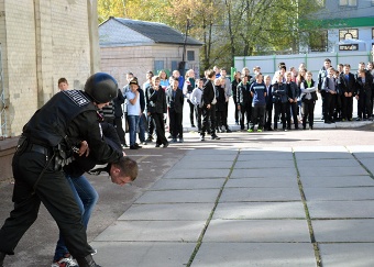 Особливий урок провели працівники державної служби охорони при УМВС для учнів Житомирської гуманітарної гімназії. Після обговорення правил безпечної поведінки вдома та у громадських місцях, міліціонери продемонстрували школярам справжню спецоперацію по затриманню злочинця.